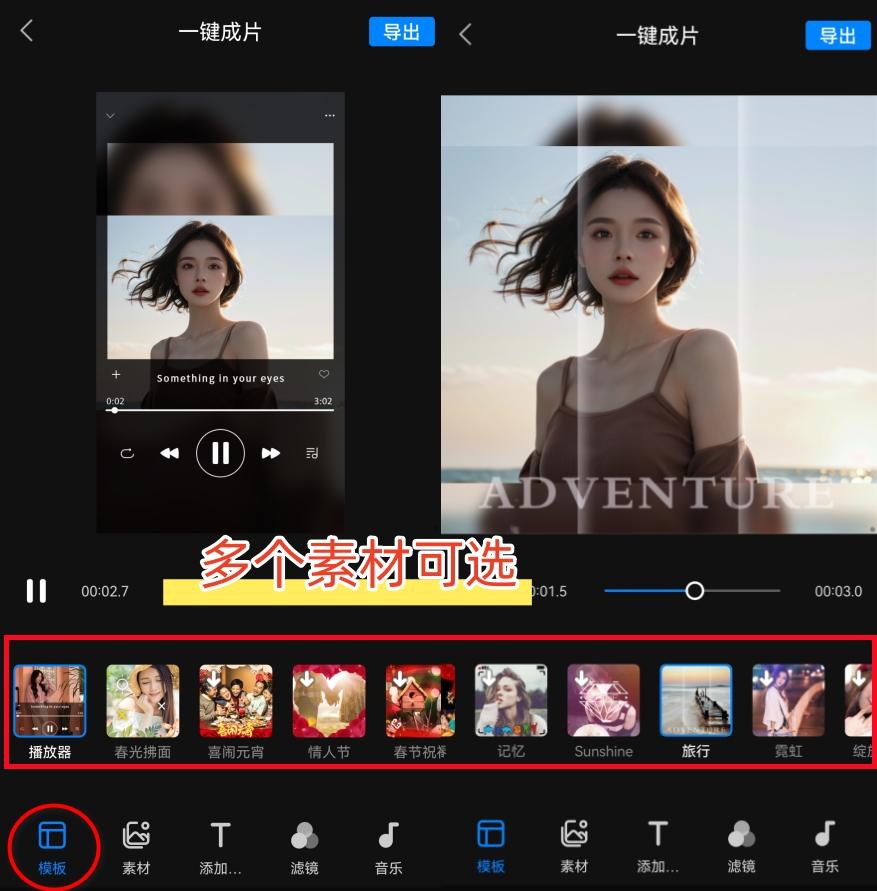 新手友好点 :模板库超丰富(搜“电影感”能找到《流浪地球》《老友记》同款转场),点击“一键套用”就能用自己的素材替换。
